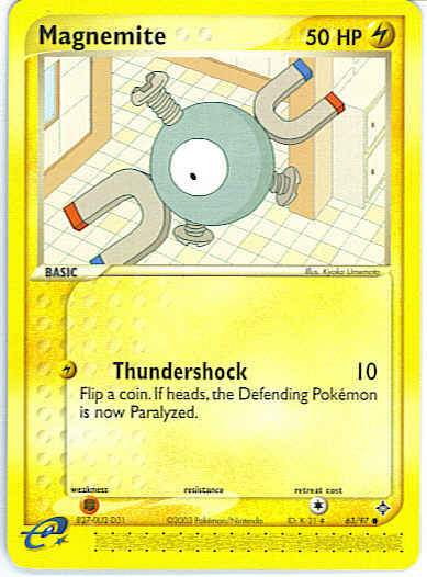 | Type | Lightning | | Pokemon serie | Dragon | | Stadie | Basic | | HP | 50 | | Sjældenhed | Common | | Tilbagetrækning | 1 | | Svaghed | F | | Kortnummer | 63 | | Evne | [L] Thundershock (10) Flip a coin. If heads, the Defending Pokemon is now Paralyzed. | | Evne2 | [L] Thundershock (10) Flip a coin. If heads, the Defending Pokemon is now Paralyzed. | | Kunstner | Kyoko Umemoto |