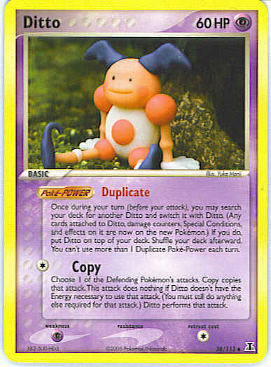 | Type | Psychic | | Pokemon serie | Delta Species | | Stadie | Basic | | HP | 60 | | Sjældenhed | Uncommon | | Tilbagetrækning | 1 | | Svaghed | P | | Kortnummer | 38 | | Evne | on it are now on the new Pokemon.) If you do, put Ditto on top of your deck. Shuffle your deck afterward. You can't use more than 1 Duplicate Poke-Power each turn. (Poke-POWER)