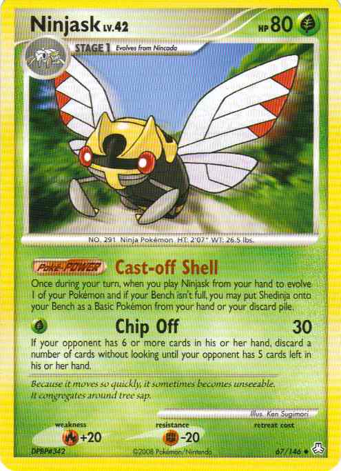 | Type | Grass | | Pokemon serie | Legends Awakened | | Stadie | Stage 1 | | HP | 80.0 | | Sjældenhed | Uncommon | | Tilbagetrækning | 0.0 | | Modstand | F-20 | | Svaghed | R+20 | | Kortnummer | 67 | | Evne | [G] Chip Off (30) If your opponent has 6 or more cards in his or her hand, discard a number of cards without looking until your opponent has 5 cards left in his or her hand.