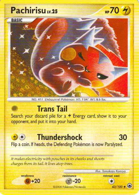 | Type | Lightning | | Pokemon serie | Majestic Dawn | | Stadie | Basic | | HP | 70.0 | | Sjældenhed | Uncommon | | Tilbagetrækning | 1.0 | | Modstand | M-20 | | Svaghed | F+20 | | Kortnummer | 43 | | Evne | [0] Trans Tail - Search your discard pile for a L Energy card, show it to your opponent, and put it into your hand. [CL] Thundershock (30) Flip a coin. If heads, the Defending Pokemon is now Paralyzed.