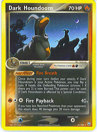 | Type | Darkness Fire | | Pokemon serie | Team Rocket Returns | | Stadie | Stage 1 | | HP | 70 | | Sjældenhed | Uncommon | | Tilbagetrækning | 1 | | Svaghed | W | | Kortnummer | 37 | | Evne |