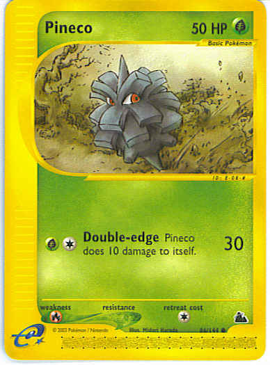 | Type | Grass | | Pokemon serie | Skyridge | | Stadie | Basic | | HP | 50 | | Sjældenhed | Common | | Svaghed | R | | Kortnummer | 86 | | Evne | [CG] Double-edge (30) Pineco does 10 damage to itself.