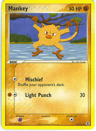 | Type | Fighting | | Pokemon serie | Fire Red Leaf Green | | Stadie | Basic | | HP | 50 | | Sjældenhed | Uncommon | | Tilbagetrækning | 1 | | Svaghed | P | | Kortnummer | 38 | | Evne | [C] Mischief - Shuffle your opponent's deck. [CF] Light Punch (30) | | Evne2 | [C] Mischief - Shuffle your opponent's deck. [CF] Light Punch (30) | | Kunstner | Miki Tanaka |