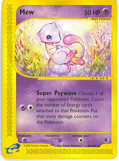 | Type | Psychic | | Pokemon serie | Expedition | | Stadie | Basic | | HP | 50 | | Sjældenhed | Rare | | Tilbagetrækning | 1 | | Svaghed | P | | Kortnummer | 55 | | Evne |