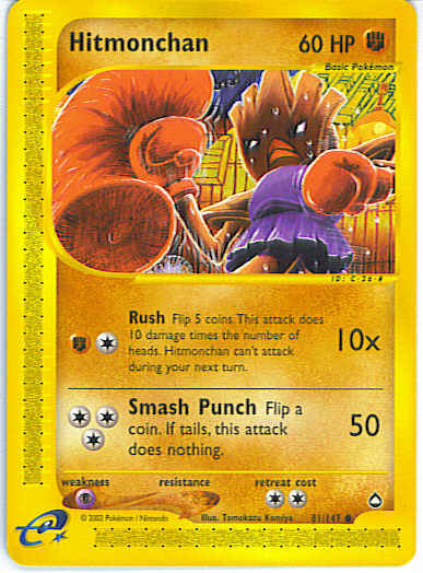 Evne2[CF] Rush (10x) Flip 5 coins. This attack does 10 damage times the number of heads. Hitmonchan can't attack during your next turn.