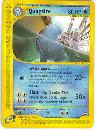 | Type | Water | | Pokemon serie | Aquapolis | | Stadie | Stage 1 | | HP | 80 | | Sjældenhed | Rare | | Tilbagetrækning | 2 | | Svaghed | G | | Kortnummer | 30 | | Evne | [W] Water Gun (20+) Does 20 damage plus 10 more damage for each W Energy attached to Quagsire. You can't add more than 20 damage in this way. [CCCC] Slam (50x) Flip 2 coins. This attack does 50 damage times the number of heads.
