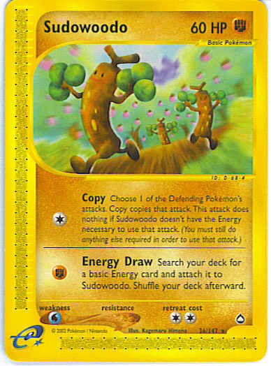 Evne[C] Copy - Choose 1 of the Defending Pokemon's attacks. Mimic copies that attack including its Energy cost and anything else required in order to use that attack, such as discarding Energy cards. (If you can't pay for that attack's Energy cost, this attack does nothing.) (No matter what type the Defending Pokemon is, Sudowoodo's type is still F.) Sudowoodo performs that attack.