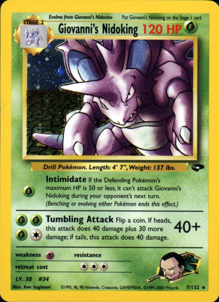Evne2 [G] Intimidate - If the Defending Pokemon's maximum HP is 50 or less, it can't attack Giovanni's Nidoking during your opponent's next turn. (Benching or evolving either Pokemon ends this effect.)