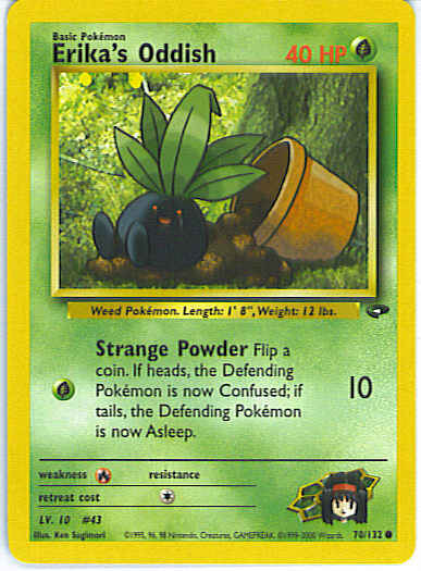 | Type | Grass | | Pokemon serie | Gym Challenge | | Stadie | Basic | | HP | 40 | | Sjældenhed | Common | | Tilbagetrækning | 1 | | Svaghed | R | | Kortnummer | 70 | | Evne |