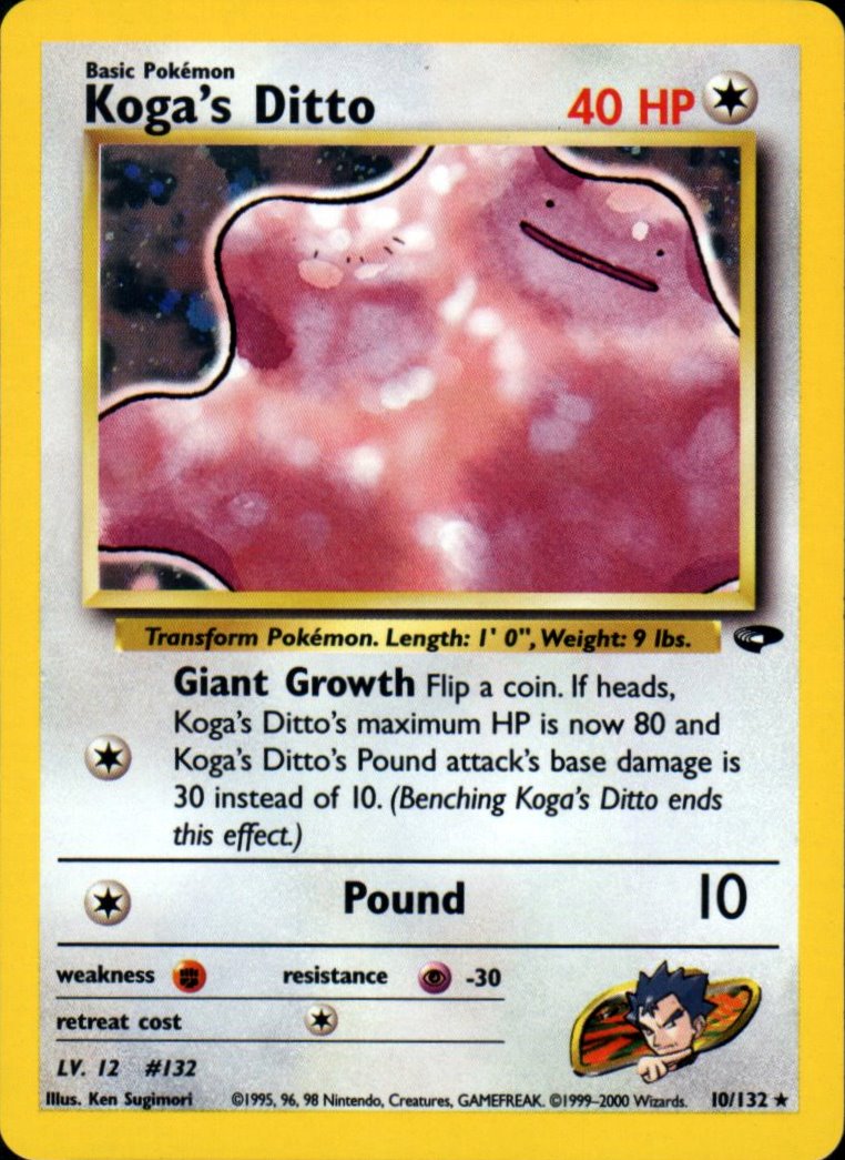 Evne [C] Giant Growth - Flip a coin. If heads, Koga's Ditto's maximum HP is now 80 and Koga's Ditto's Pound attack's base damage is 30 instead of 10. (Benching Koga's Ditto ends this effect.)