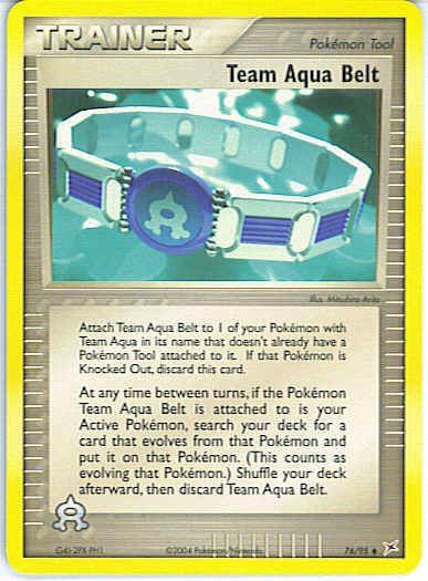 | | Evne2 | At any time between turns, if the Pokemon Team Aqua Belt is attached to is your Active Pokemon, search your deck for a card that evolves from that Pokemon and put it on that Pokemon. (This counts as evolving that Pokemon.) Shuffle your deck afterward, then discard Team Aqua Belt.