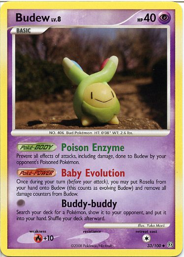 | Type | Psychic | | Pokemon serie | Stormfront | | Stadie | Basic | | HP | 40.0 | | Sjældenhed | Uncommon | | Tilbagetrækning | 1.0 | | Svaghed | R+10 | | Kortnummer | 33 | | Evne | of attacks, including damage, done to Budew by your opponent's Poisoned Pokemon. (Poke-BODY)Baby Evolution - Once during your turn (before your attack), you may put Roselia from your hand onto Budew (this counts as evolving Budew) and remove all damage counters from Budew. (Poke-POWER)