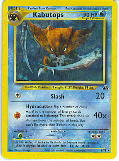[F] Hydrocutter (40x) Flip a number of coins equal to the number of Energy cards attached to Kabutops. This attack does 40 times the number of heads. You can't flips more than 3 coins in this way.