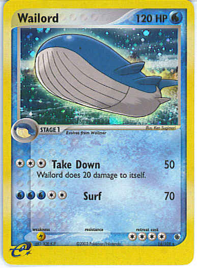 | Type | Water | | Pokemon serie | Ruby Sapphire | | Stadie | Stage 1 | | HP | 120 | | Sjældenhed | Rare | | Tilbagetrækning | 4 | | Svaghed | L | | Kortnummer | 14 | | Evne | [CCC] Take Down (50) Wailord does 20 damage to itself. [CCWWW] Surf (70)