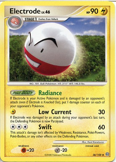Evne[L] Low Current (30) If Electrode was damaged by an attack during your opponent's last turn, the Defending Pokemon is now Paralyzed.