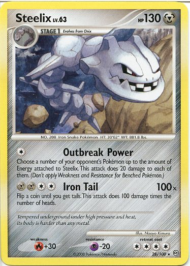 Evne [C] Outbreak Power - Choose a number of your opponent's Pokemon up to the amount of Energy attached to Steelix. This attack does 20 damage to each of them. (Don't apply Weakness and Resistance for Benched Pokemon.)