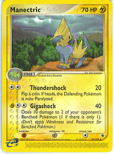 | | Evne2 | [CC] Thundershock (20) Flip a coin. If heads, the Defending Pokemon is now Paralyzed. [CCL] Gigashock (40) Does 10 damage to 2 of your opponent's Benched Pokemon (1 if there is only 1). (Don't apply Weakness and Resistance for Benched Pokemon.)