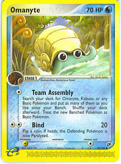 Evne2[C] Team Assembly - Search your deck for Omanyte, Kabuto, or any Basic Pokemon and put as many of them as you like onto your Bench. Shuffle your deck afterward. Treat the new Benched Pokemon as a Basic Pokemon.